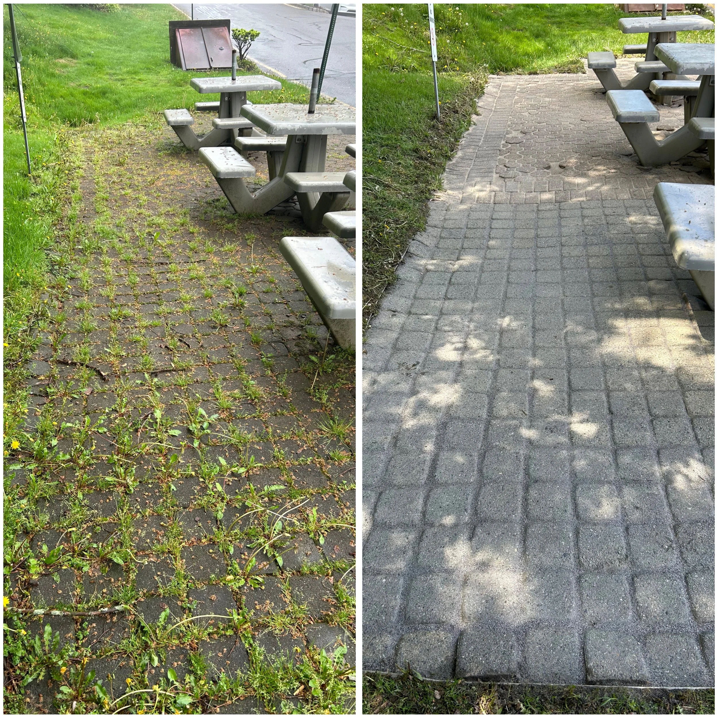 Concrete and paver cleaning: oil stain removal, mildew/algae elimination, and sealing preparation.
